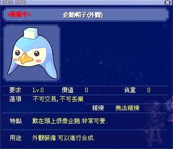 任務獎勵:[企鵝帽子(外觀)×1][56158 exp,46630 Tmexp]